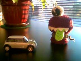 My personal Gnome, who hasn't told me his name yet, and yes, I know I owe you pictures, is sitting on my desk right now, watching me with his happy green eyes. I don't think I'll leave him here, but I don't know. He has to come home for pictures anyway.
